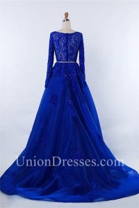 Modest Bateau Neckline Long Sleeve Royal Blue Organza Lace Beaded