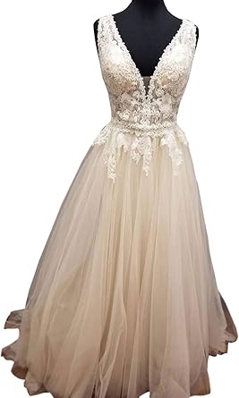 Kelaixiang Women S Champagne V Neck Tulle Lace Long Prom Dress
