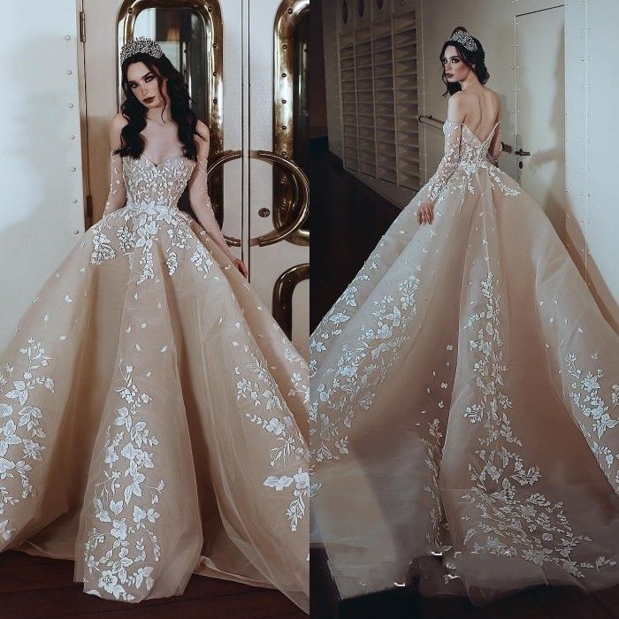 Champagne Lace Appliques Tulle Long Prom Dresses With Long Sleeves