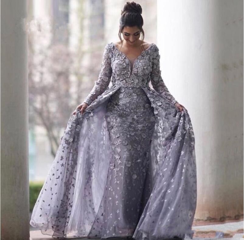 Gray Muslim Evening Dresses 2020 Mermaid V Neck Long Sleeves Tulle