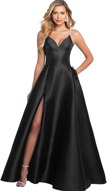 V Neck Black Satin Prom Dresses Black Long Formal Evening
