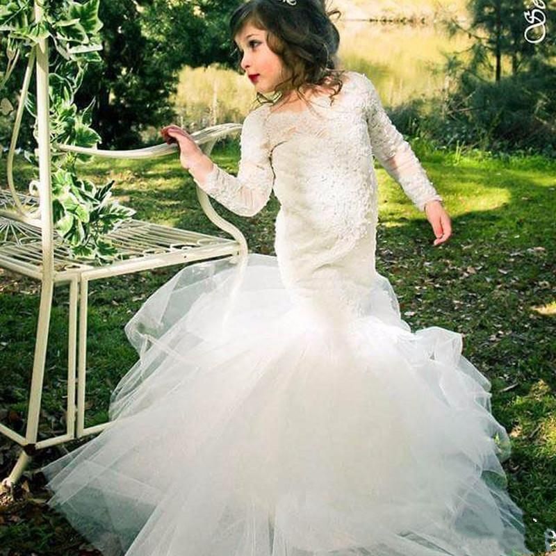 Pretty White Kids Prom Dresses Lace Applique Long Sleeve Mermaid